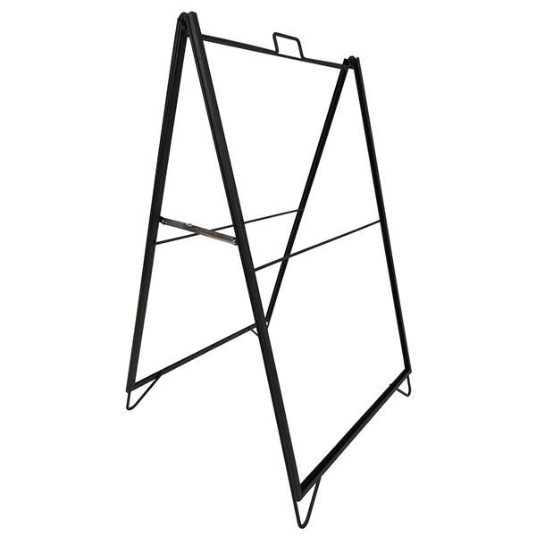 The economy metal A frames are a popular choice for businesses looking to advertise and event planners looking to improve on-site logistics. With metal A frames, the message will be bold, noticeable, and highly-visible. When not in use, metal A frames fold flat for easy storage. The economy metal A frames have a powder coated black finish that looks clean and professional. The metal A frames have a handle on top for easy transport and portability when they are collapsed. The latch on the A frame keeps it secure while on display. With the double-sided frame, you can display 2 different posters in the same A frame. Corrugated plastic sheets or rigid PVC sheets are recommended for outdoor usage. Fits up to 7mm thick material. Posters slide in from the top. Simply slide down the posters into the channels and onto the channel of the A frame at the bottom. Poster not included. Not recommended for use in excessive wind conditions. Printing is also available at extra cost.