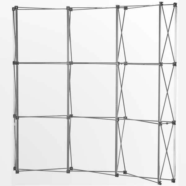 Premium curve shaped aluminum frame. This pop-up display is lightweight yet very stable and easy to set up compared to other similar pop-up displays. Comes with two (2) halogen lights, magnetic channel bars, PVC panels for the pop up frame, and a rigid carrying case with wheels. Printing not included. Indoor use only.