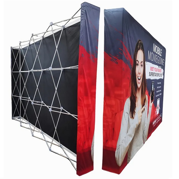Fabric pop-up displays are the next generation of large graphics presentations. A fabric banner is attached to the frame with Velcro. The entire banner is fabricated in one piece that remains mounted to the frame. Set up in seconds and packed just as quickly. Fire retardant (CAN/ULC-S109) fabric (250gsm knitted polyester) is also available. Comes with two (2) halogen lights and a rigid carrying case with wheels. We offer complete packages including printing and finishing or we can supply hardware only. Indoor use only. 5ft x 5ft table top version is also available. Printing usually takes 7 business days.