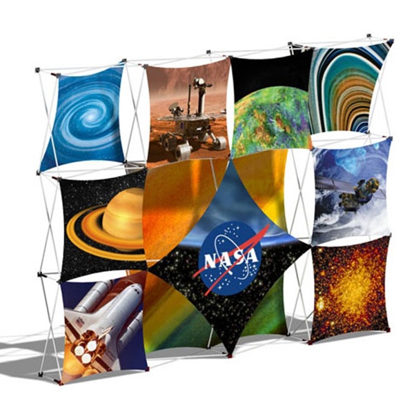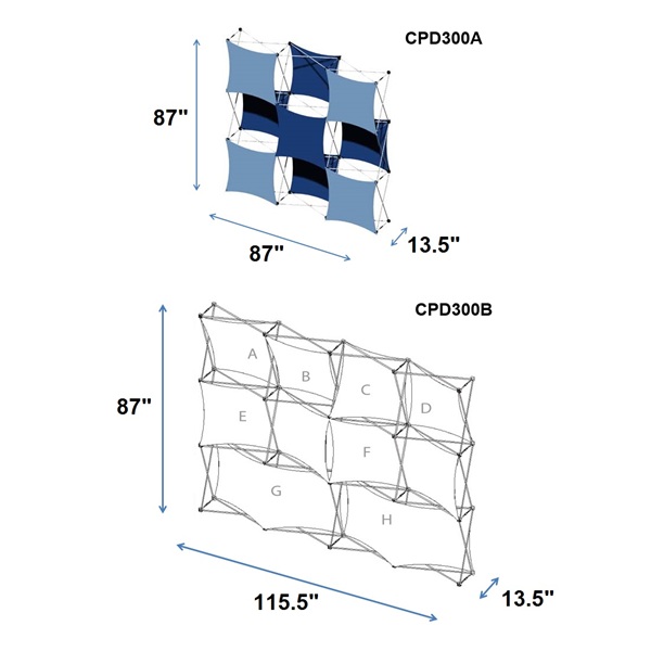 Geometric Fabric Display is one of our most unique product offerings. The CPD300 series offers many of the features the exhibitors look for in a high-quality display, including versatility, 3d capabilities, lightweight, easy setup, and easy customization and exchange of graphics. The same display can be used for many applications in many venues: trade shows, media presentations, retail showrooms, fundraisers, corporate meetings, etc. Fabrics are attached to the frame by using eyelets or buttonholes at the corners. The CPD300 series offers a different look and style that can be changed from show to show. Set up in seconds and packed just as quickly. Comes with two (2) halogen lights and a rigid carrying case with wheels. We offer complete packages including printing and finishing, or we can just supply hardware only. Indoor use only. Printing usually takes 8 business days.