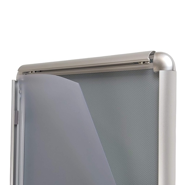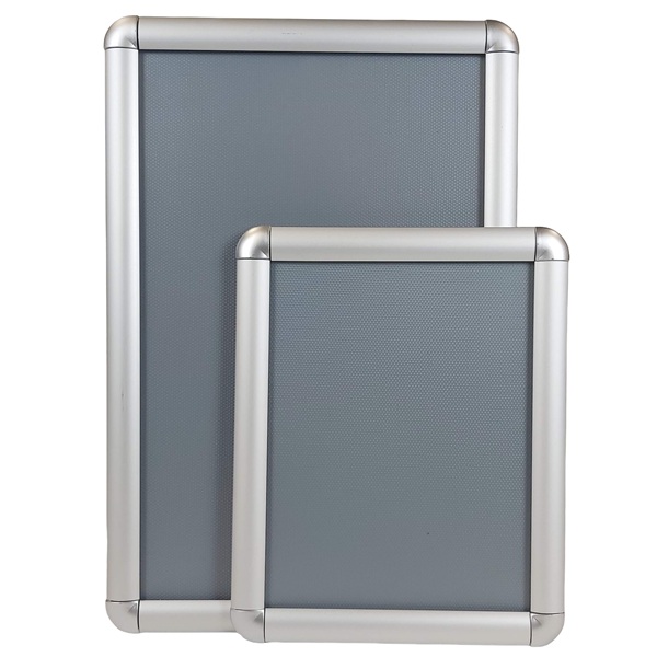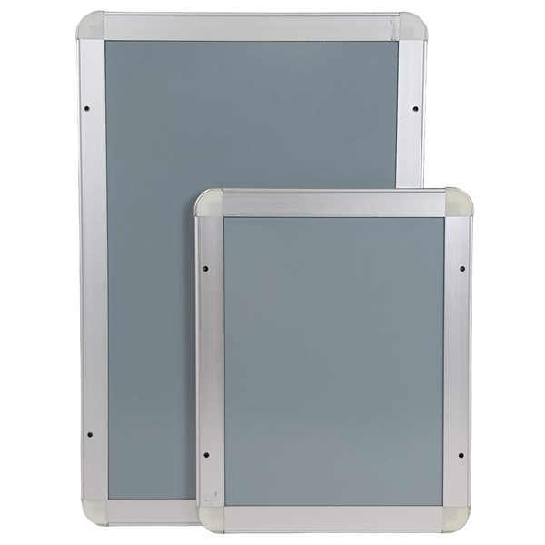 Chrome plated round corner snap aluminum poster frame. Super slim profile, 2.5 cm wide frame. Comes with a matte PVC protective sheet. It can be hung vertically or horizontally. Black color available in 24″x36″. Includes screws and drywall plastic anchors. Poster not included. Indoor use only.