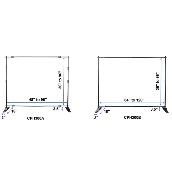 Indoor aluminum banner hanging stand. Light weight and portable. Height and width are adjustable to fit various size banner. Either grommets or 3″ top & bottom pole pockets are required to install the banner on the stand. Best choice to display large visuals. It comes with a durable carrying bag. Indoor use only. Banner not included. Both fabric and vinyl banner printing is available at extra cost.