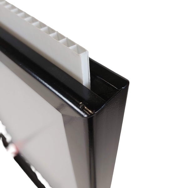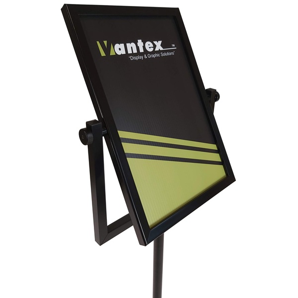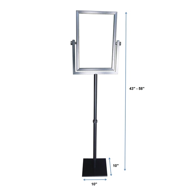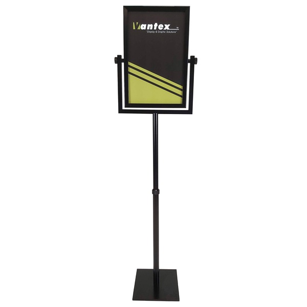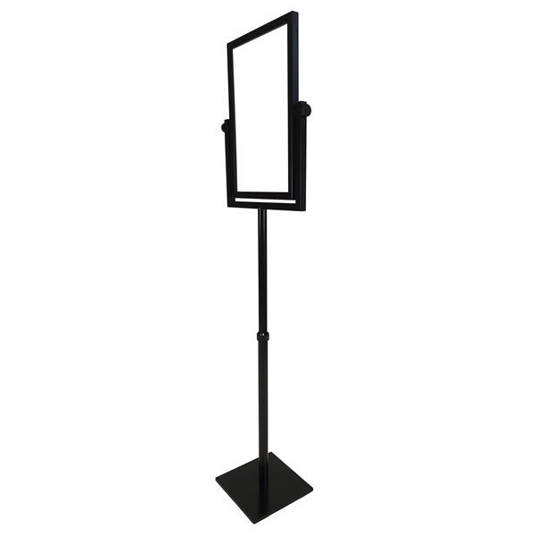 Double sided steel poster frame with telescopic pole. Adjustable height between 43″ and 58″ (ground to top of the frame). Holds a standard 11.5″ x 17.5″ poster. The poster is visible from both sides. The top-insert slot on the metal frame is 1/4″ deep and is designed for quick graphic changes. Suitable for coroplast or foam core poster. The poster frame can be tilted. Powder coated Black finish. Recommended for indoor advertising. Poster not included. Indoor use only.
