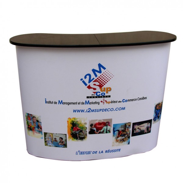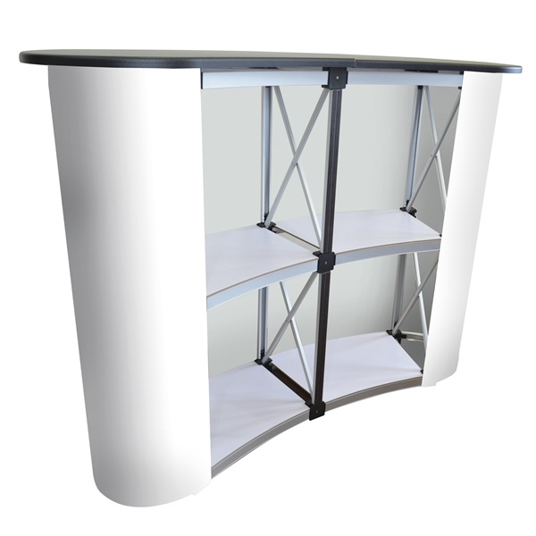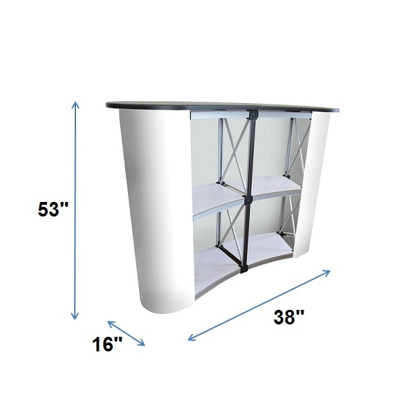 Aluminum curve shaped pop-up table with black counter-top. A perfect addition to trade show booths or sales promotions. Light and portable but sturdy. Includes a middle shelf. Comes with a white PVC panel and a carrying bag. Printing is not included but available at an extra cost. Indoor use only.
