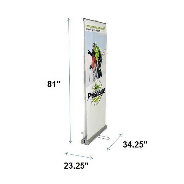 Aluminum double-sided retractable roll-up stand. Strong and sturdy construction with heavy-duty moulded end plates. Snap aluminum top frame holds the banner securely. Comes with a durable padded carrying bag. Banner not included. Anti-curl banner printing is available at an extra cost. Indoor use only.