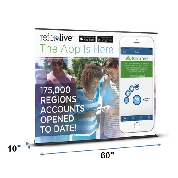 Extra wide black powder coated premium aluminum retractable roll-up stand. Super effective marketing tool at an extra affordable price. Quick and simple set up. Perfect for retail, point-of-purchase, and trade show advertising. Banner not included. Anti-curl banner printing is available at an extra cost. Indoor use only.
