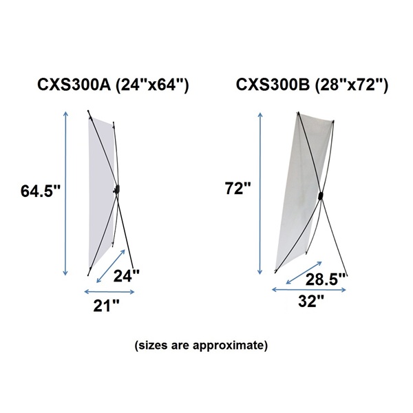 Folding PVC X-stand. Designed for a banner with grommets in each corner. Ideal for trade shows or retail advertising. Comes with a nylon carrying bag. Banner not included, but printing is available at an extra cost. Indoor use only.