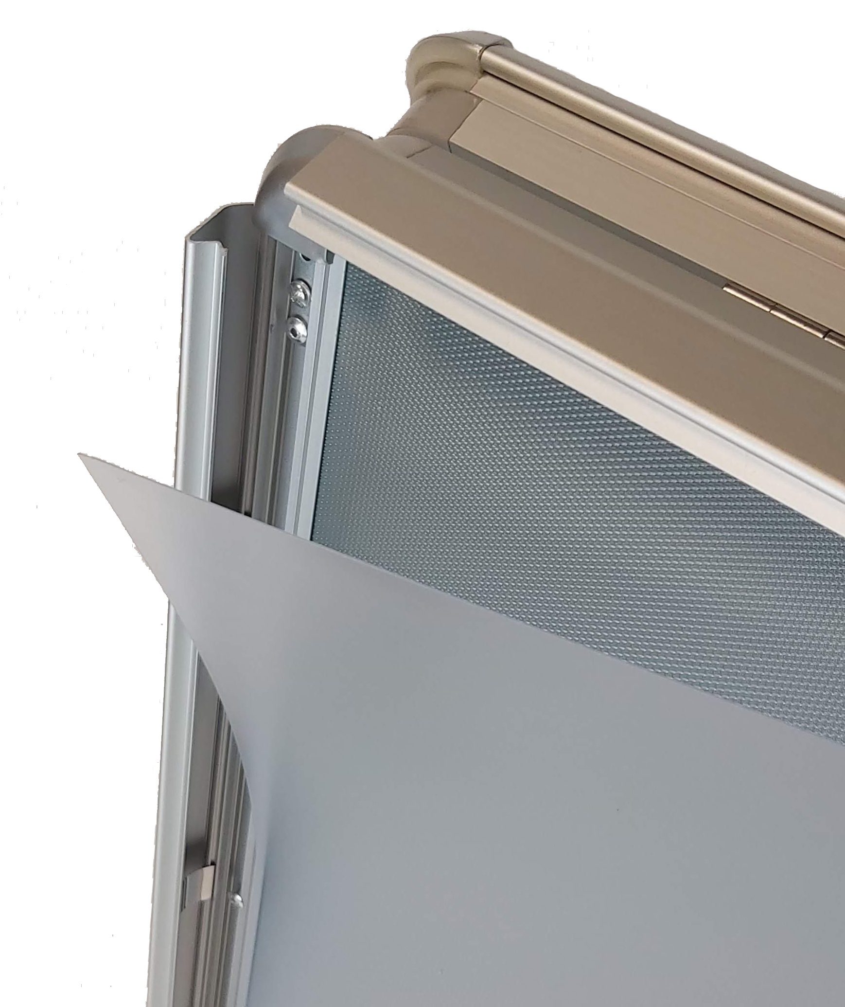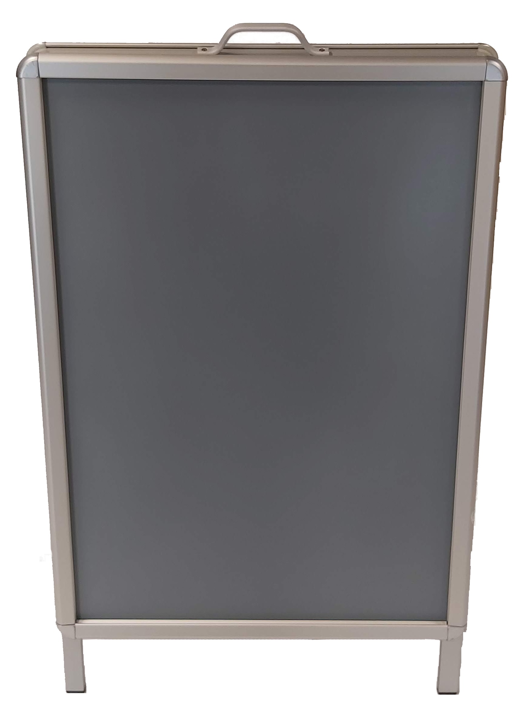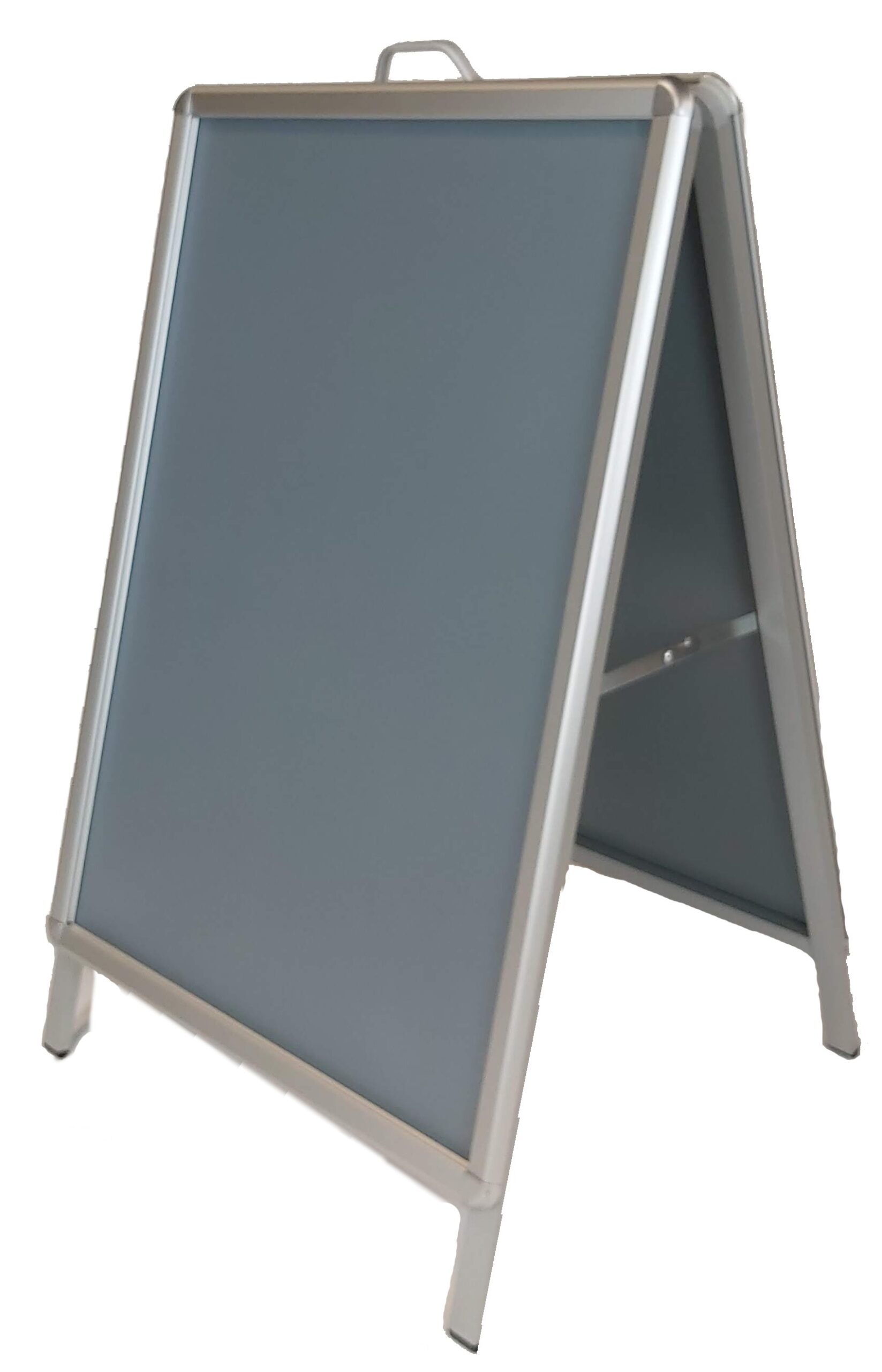 Snap aluminum frame sandwich board. This double-sided poster frame is lightweight and posters are easy to change. Comes with two (2) matte protective transparent sheets to protect posters on both sides. Accepts 2 posters. Suitable for paper or film posters. Recommended for indoor advertising. Posters not included.