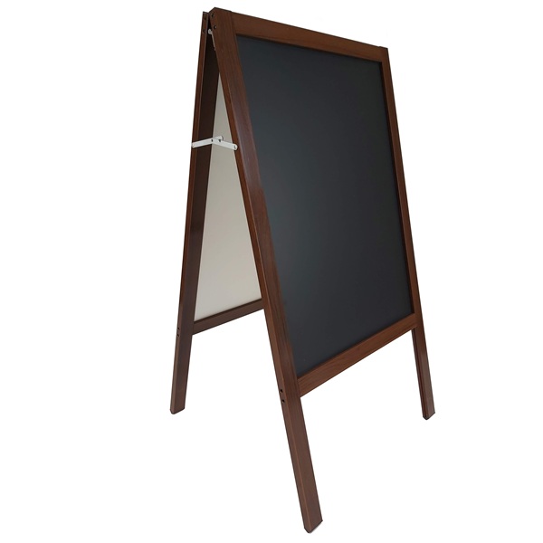 High-quality mahogany-finished aluminum frame chalkboard. The frame is made out of aluminum and painted in natural mahogany wood color, and the chalkboard is made out of Zinc coated material. It can be written on with both chalks and erasable markers. This double-sided aluminum frame sandwich board is lightweight and easy to carry. Perfect for restaurants, coffee shops, and retail shops. Recommended for indoor and covered outdoor advertising.